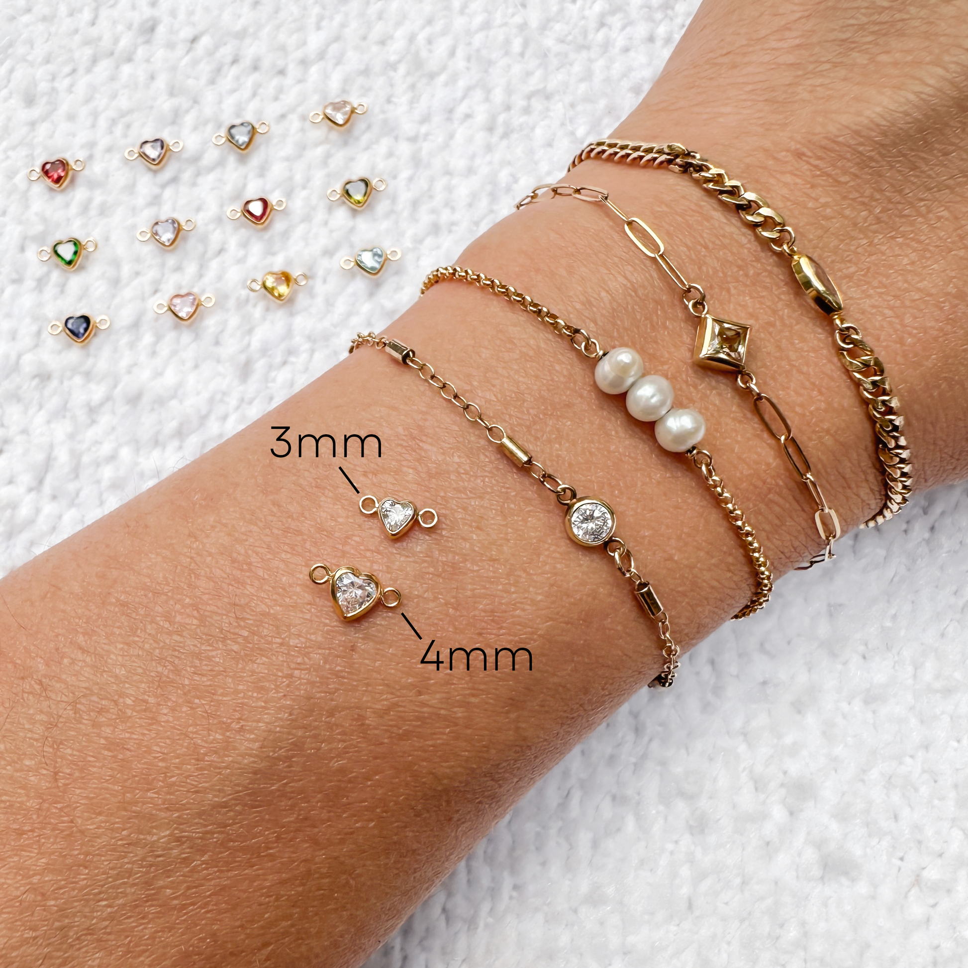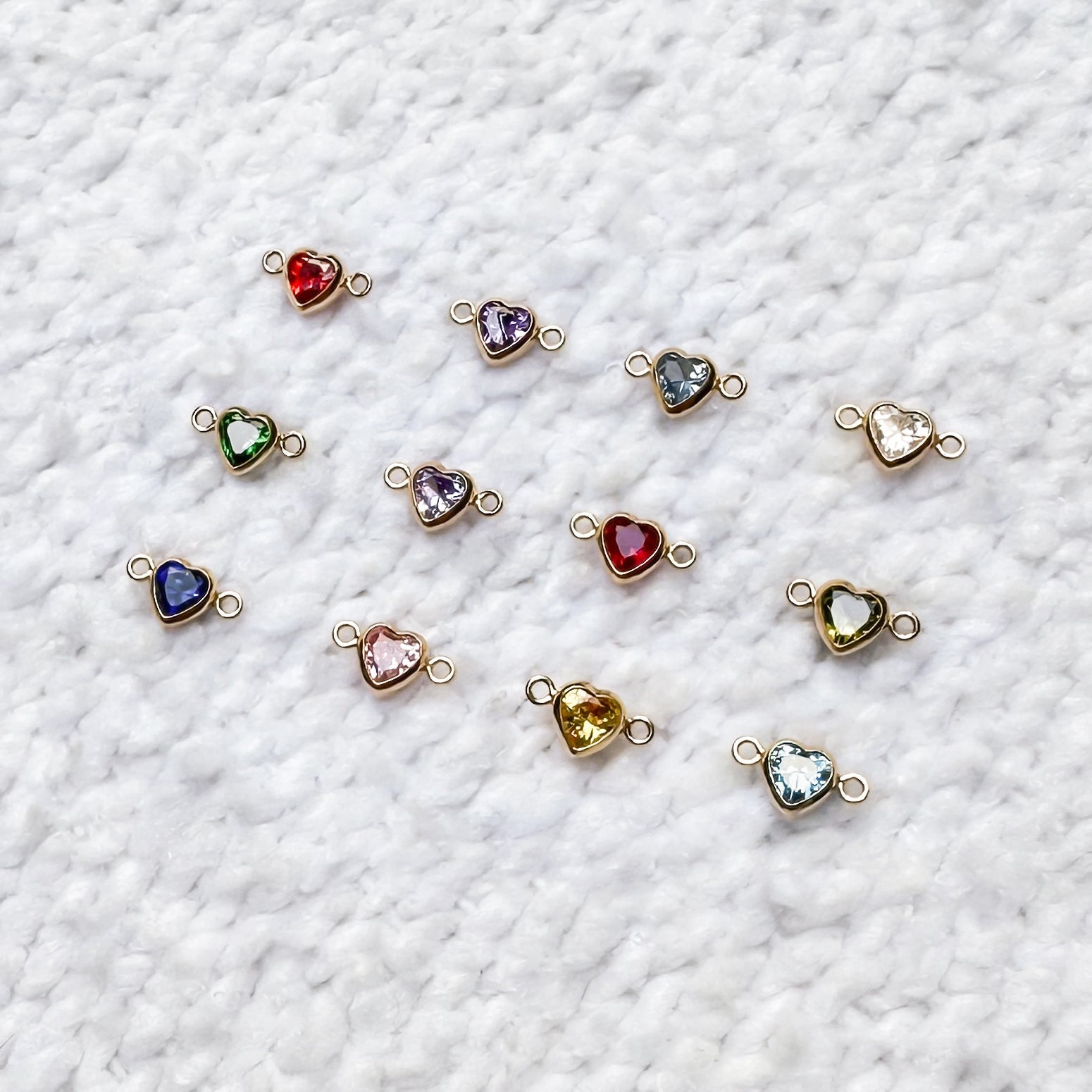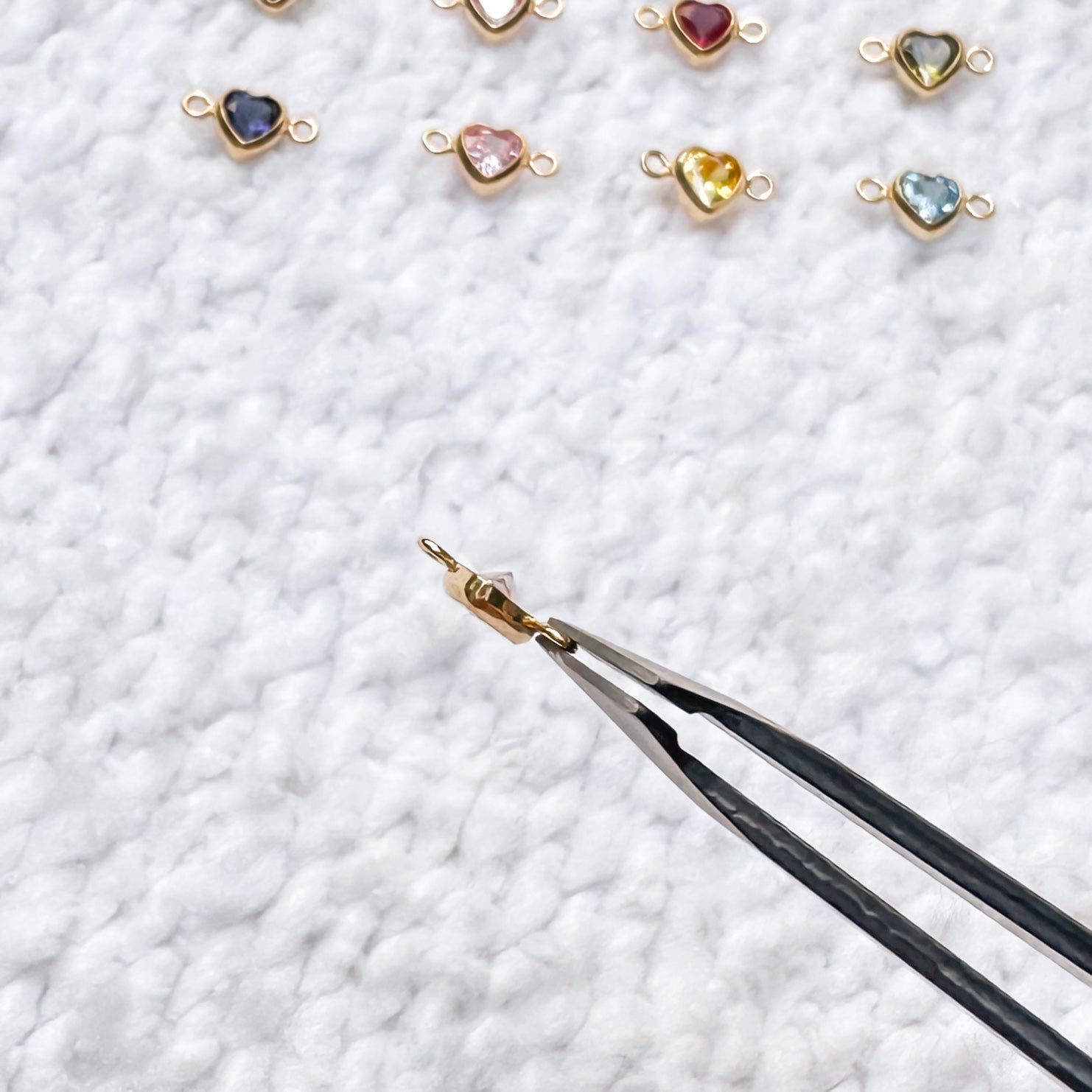 Personalize your permanent jewelry with our elegant heart shaped birthstone connectors. Each piece features a beautifully detailed zircon stone, perfect for adding a sparkle to bracelets, anklets, and necklaces. Crafted from high-quality 14k gold filled and sterling silver materials, these connectors allow for a meaningful, customized design that reflects the wearer’s birth month or favorite color.